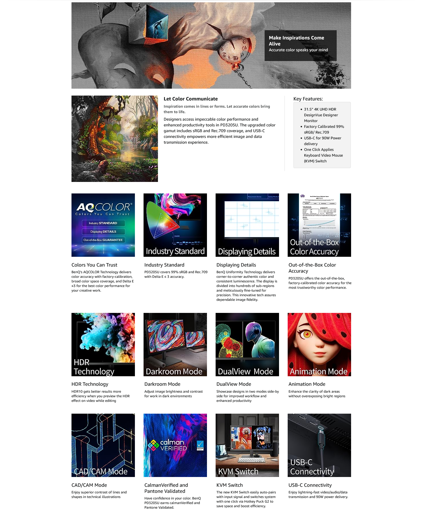BenQ PD3205U 31.5″ (80.01 cm) LCD 3840 x 2160 Pixels 4K Monitor, UHD, sRGB, Rec.709, HDR10, IPS, AQCOLOR Technology, Factory-Calibrated, Color Mode, Darkroom Mode,CAD/CAM Mode,Hotkey Puck G2,KVM,Grey