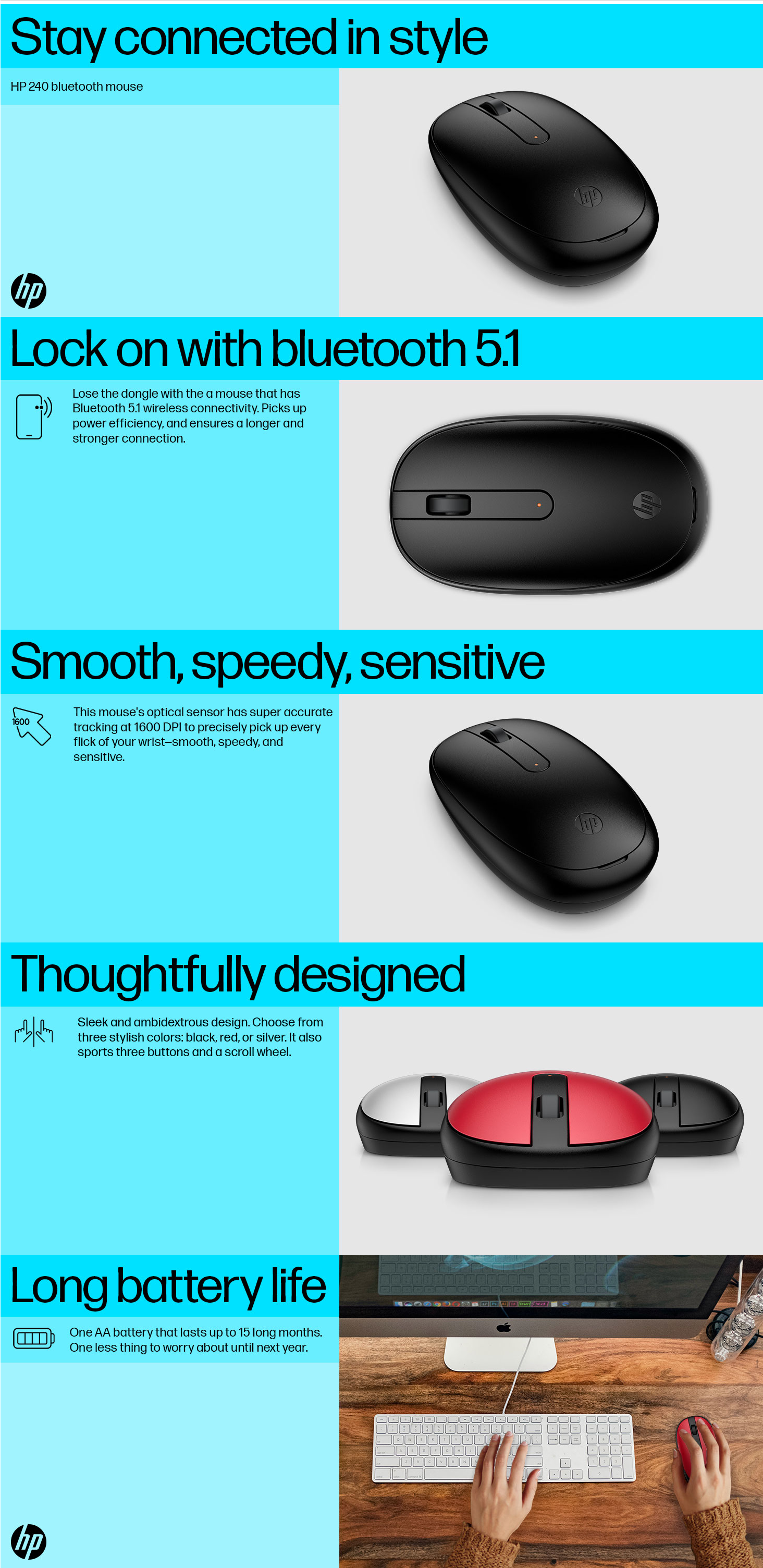 HP 240 Bluetooth Wireless Mouse with 3 Buttons/1600 DPI Red Optical Tracking/Sleek and Ambidextrous/Compatible to Windows 10, macOS, Chrome OS, 3 Years Warranty (Black)