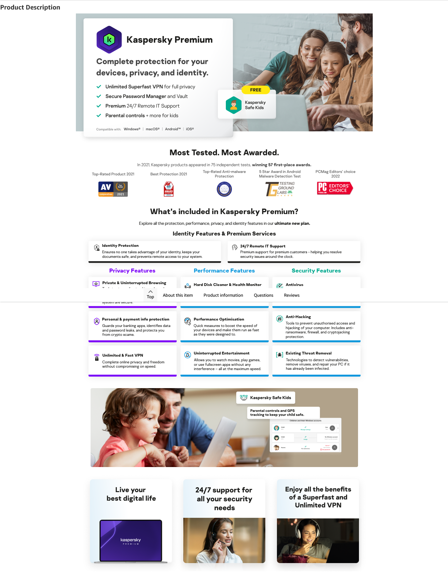 Unlimited and Fast VPN, Identity Protection, 24/7 Remote IT Support, Real-Time Anti-Virus, Anti-Hacker, Existing Threats Removal, Private and Uninterrupted Browsing, Online Banking Protection, Hard Disk Cleaner, Performance Optimization, Uninterrupted Entertainment. Kaspersky Total Security is upgraded to Kaspersky Premium with enhanced features and protection.