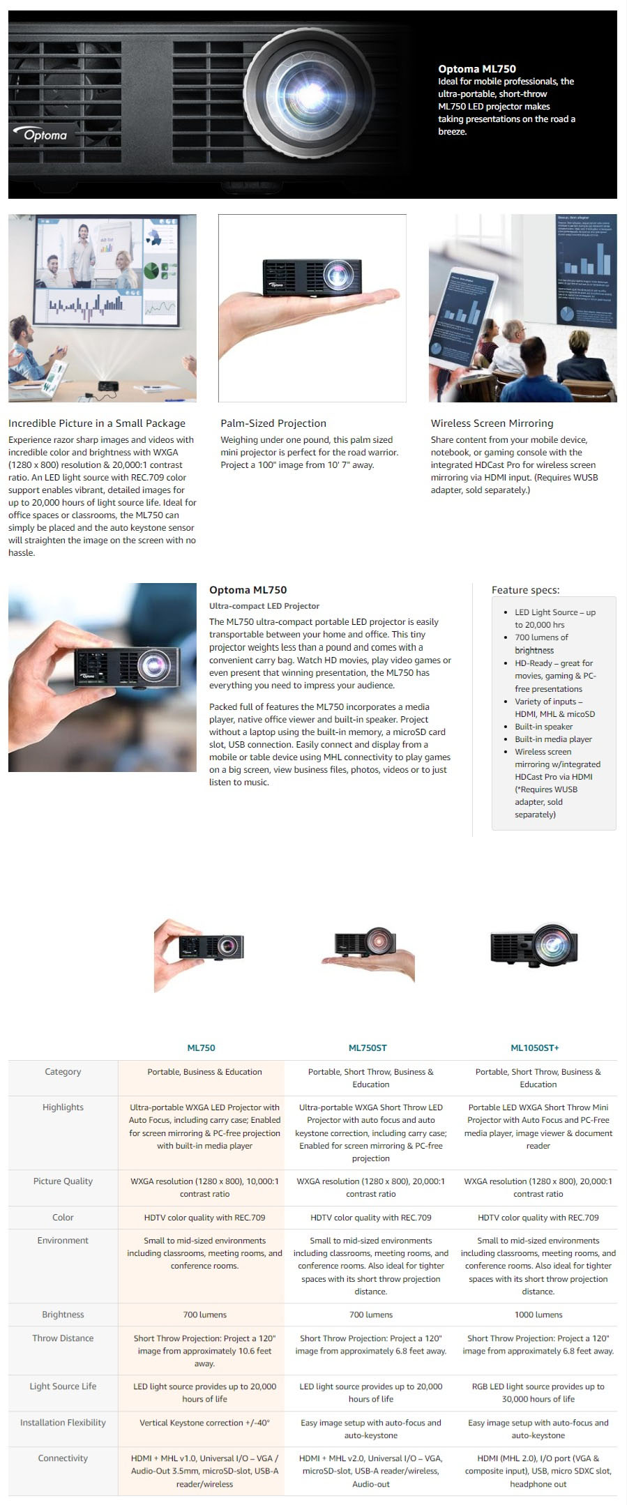 Optoma ML750 WXGA 700 Lumen 3D Ready Portable DLP LED Projector with HDMI