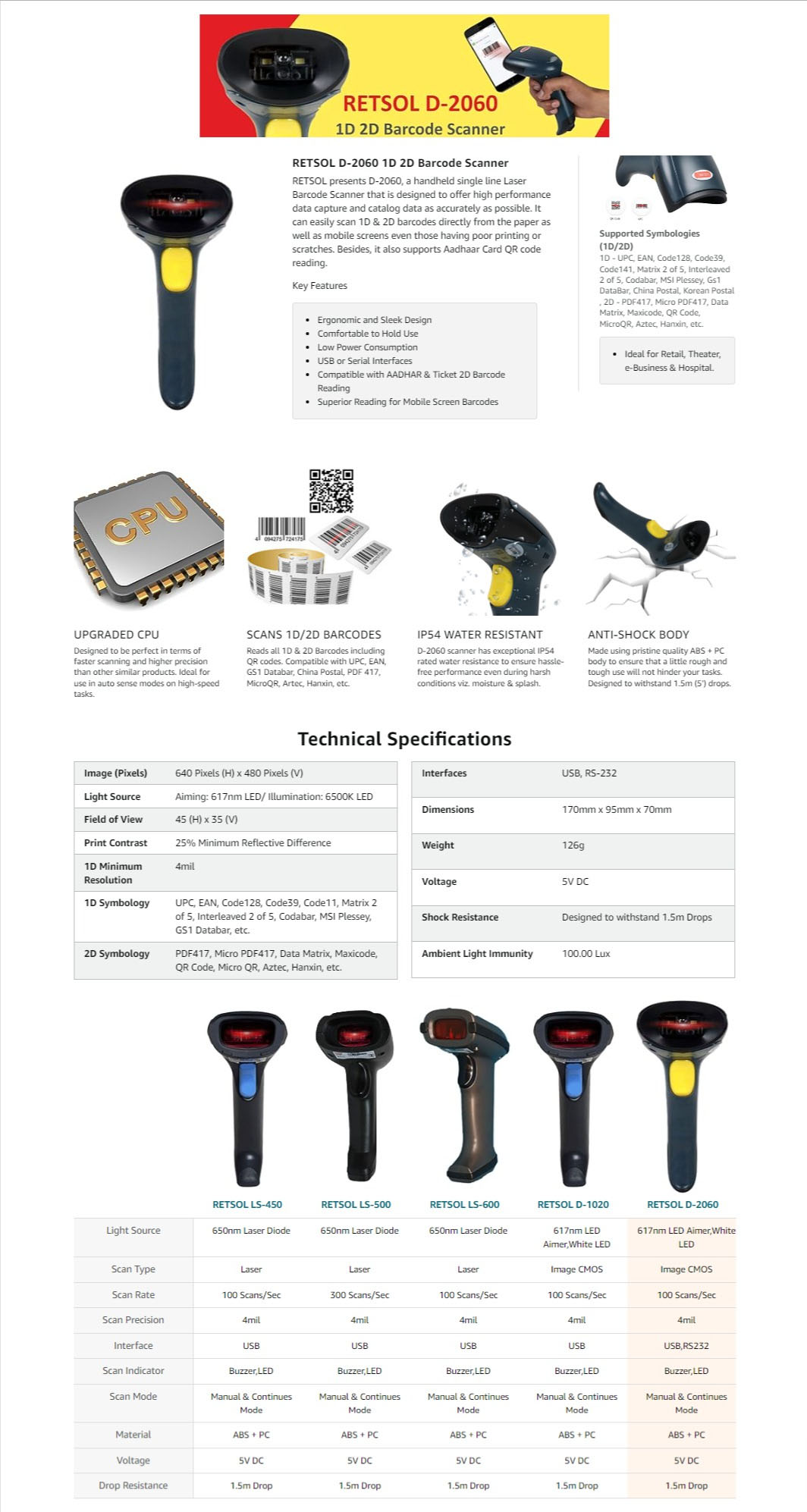 • D-2060 scanner has exceptional IP54 rated water resistance to ensure hassle-free performance even during harsh conditions viz. moisture & splash.