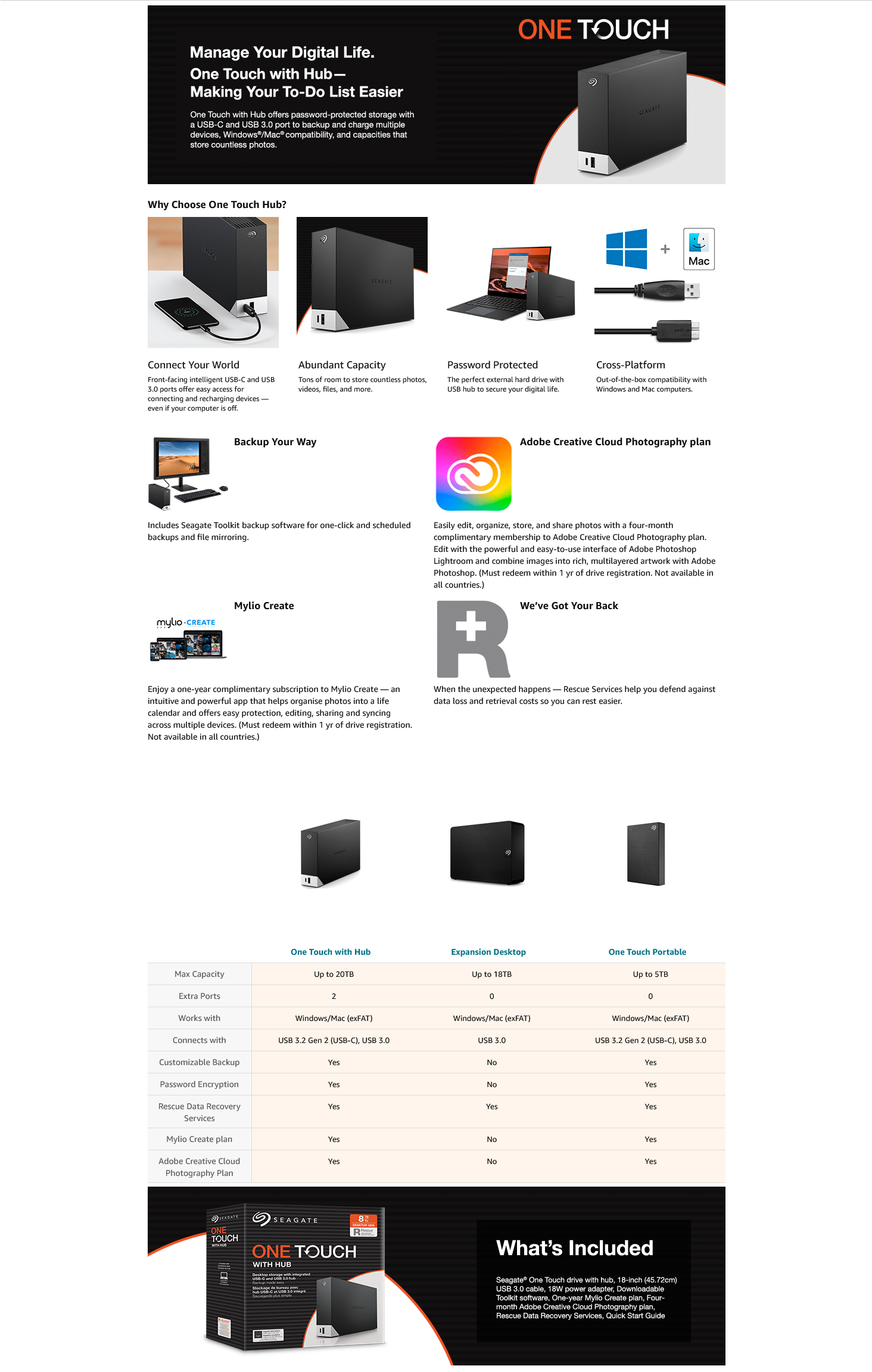 Seagate One Touch Hub 10TB Desktop External HDD – USB-C & USB 3.0 Port, with 3 yr Data Recovery Services, for Computer PC Laptop Mac, 4 Months Adobe Photography Plan (STLC10000400), Black